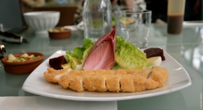 Une jolie assiette bien présentée avec une salade fraiche et croquante et un filet de poulet tendre et bien pané, et déjà coupé en lamelles puisque l’on mange avec des baguettes.